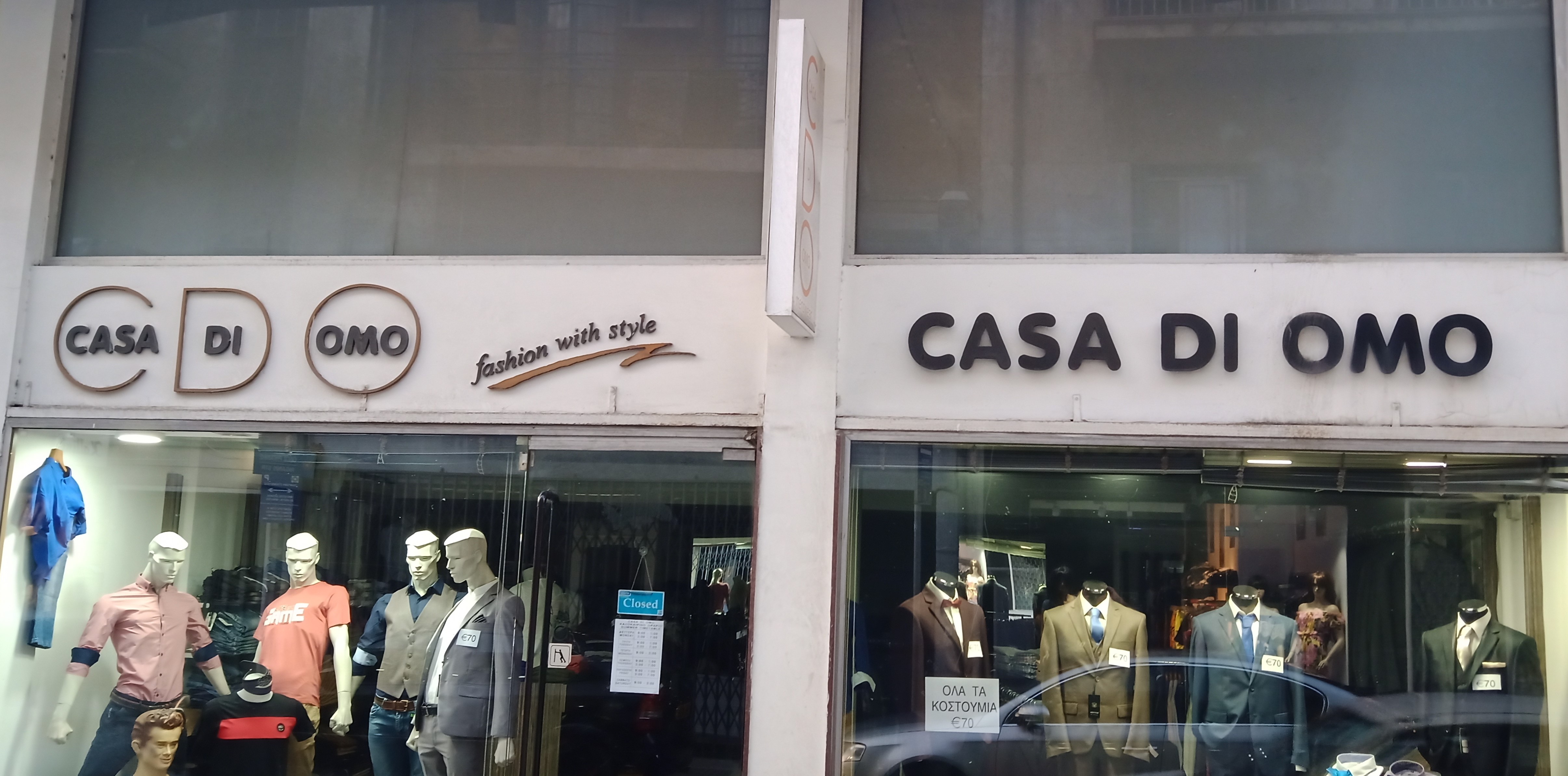 Zu lang, zu gut übersetzt und zu wenig platzsparend. Lieber die falsche und lustige Variante „CASA DI OMO“, ist doch viel kürzer und gleich so fröhlich … it's so gay! Von wegen „fashion with style“ (mittig auf dem Ladenschild zu lesen) – Es ist eher „fashion with mistakes“.
