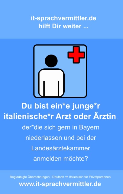Wenn Sie sich z.B. als junge*n italienische*n Arzt oder Ärztin in Bayern niederlassen und sich deswegen bei der Bayerischen Landesärztekammer ( → www.blaek.de) anmelden möchten, müssen Ihre vollständigen Unterlagen und Urkunden aus Italien ins Deutsche übersetzt und beglaubigt werden ...